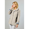 Jakken har en avtakbar hette og er fôret med et stilig marineblått og hvitt stripemønster på overkroppen, hetten og mansjettene, noe som gir et friskt og tidløst utseende.