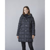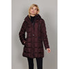 Down jacket without fur on removable hood.